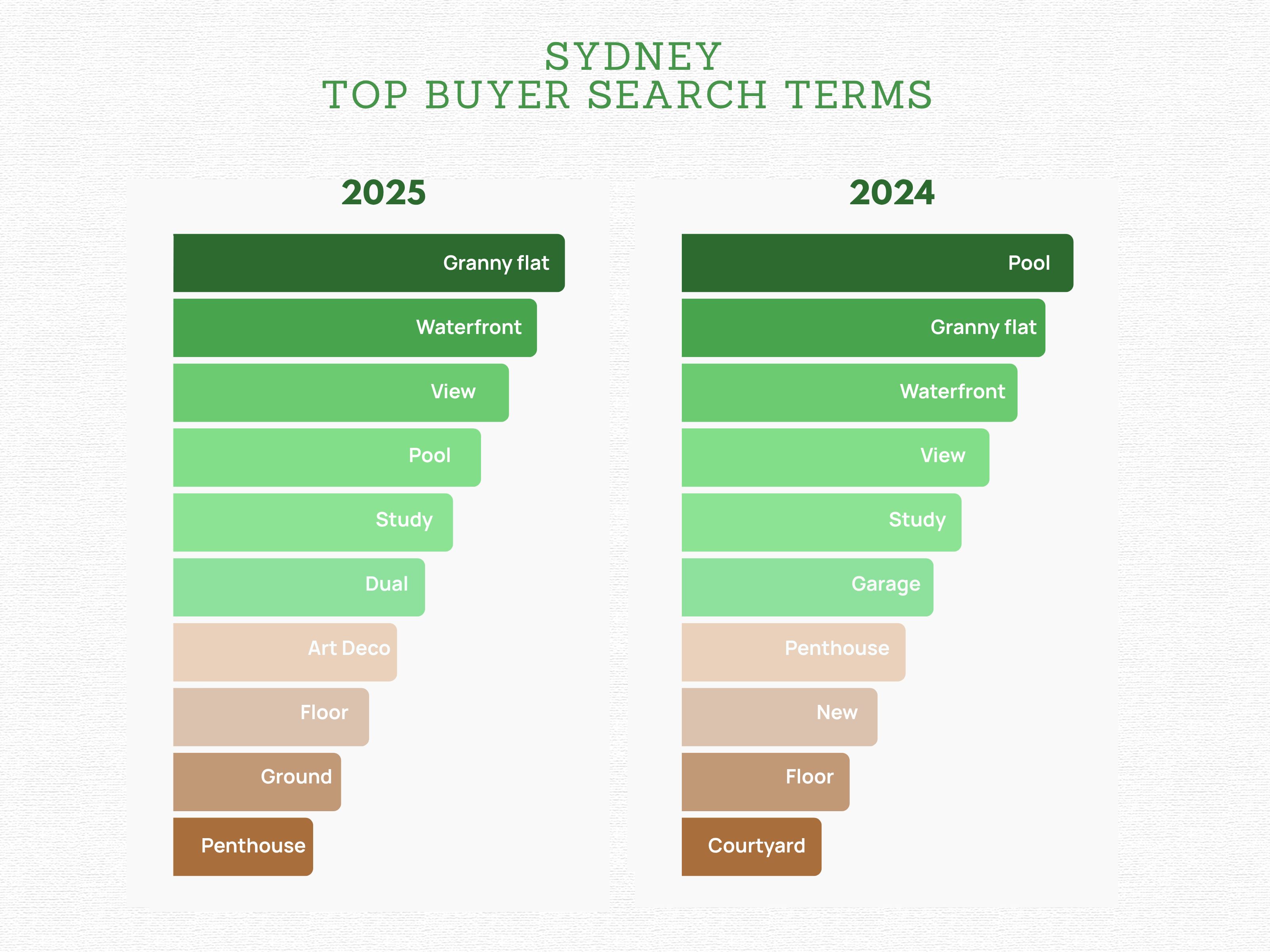 Sydney buyers are reassessing what matters most in a home. According to Domain, ‘granny flat’ has now overtaken ‘pool’ as the city’s most searched feature, signalling a shift toward practicality and value.