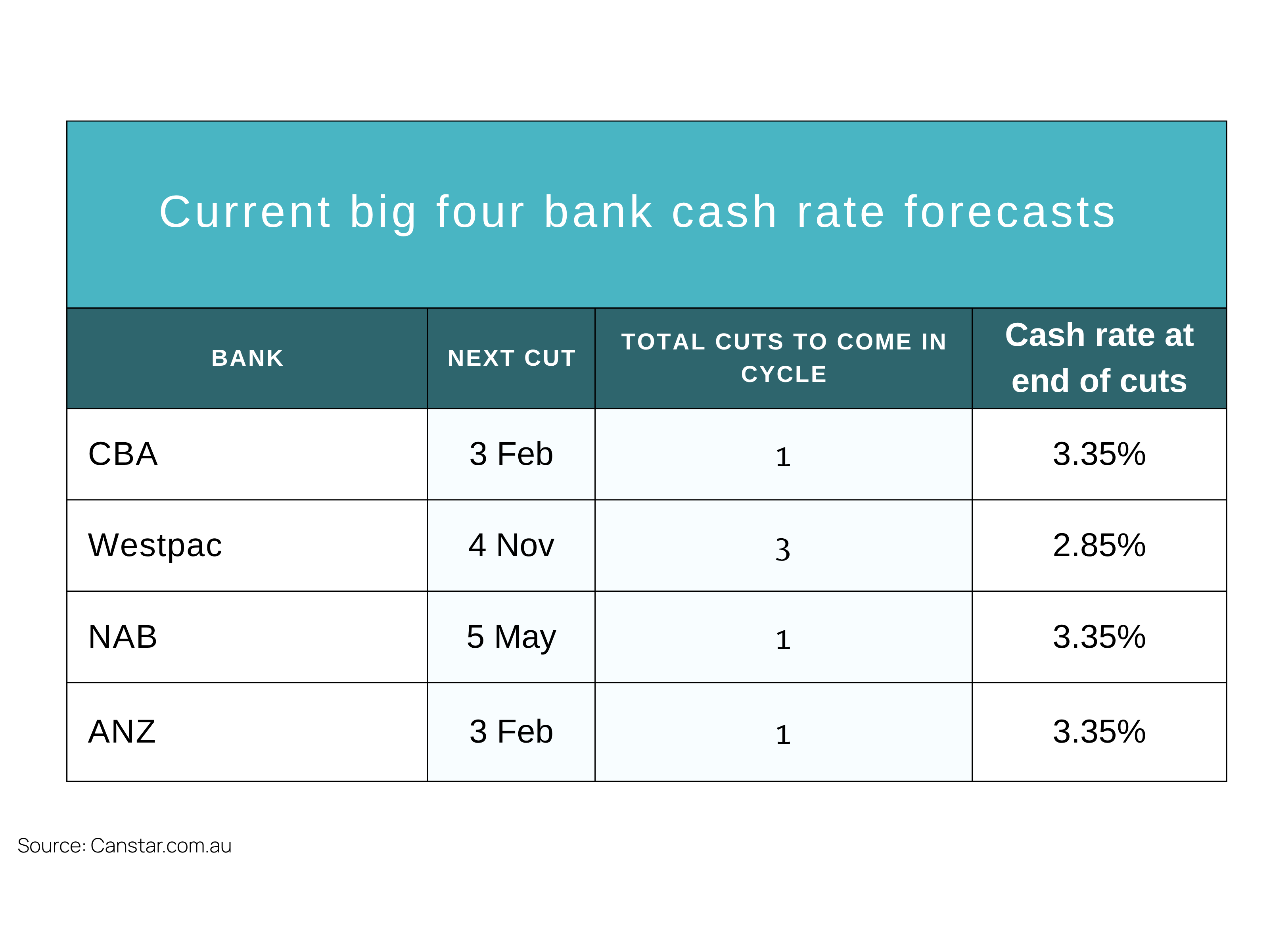 ANZ, CBA and NAB expect the first reduction to come in early to mid-next year, while Westpac maintains a slightly more optimistic view but says an earlier move remains uncertain.